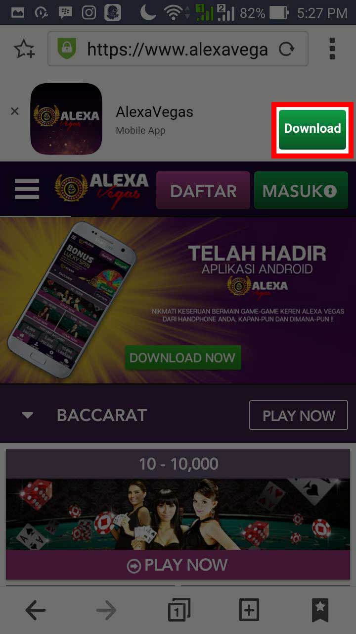 1. Masuk ke menu Browser Mobile anda dan Kunjungi www.alexavegas.com setelah itu klik menu MOBILE lalu klik button Download Now, dan tunggu proses download selesai.