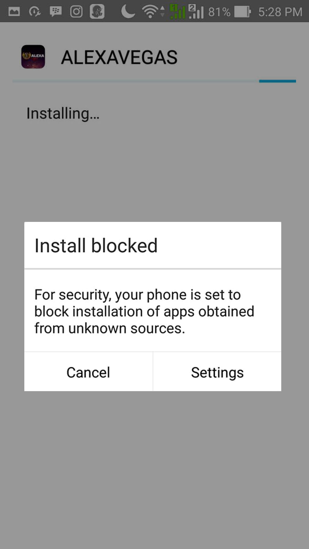 2. Jika sudah selesai, klik dan install langsung file Alexavegas.apk, jika muncul keterangan Install Blocked, Pilih dan Klik “Settings”, setelah itu pilih “ Unknown Source” di bagian “ Security”, Centang/Klik pada bagian seperti yang dilingkari pada gambar dibawah ini.